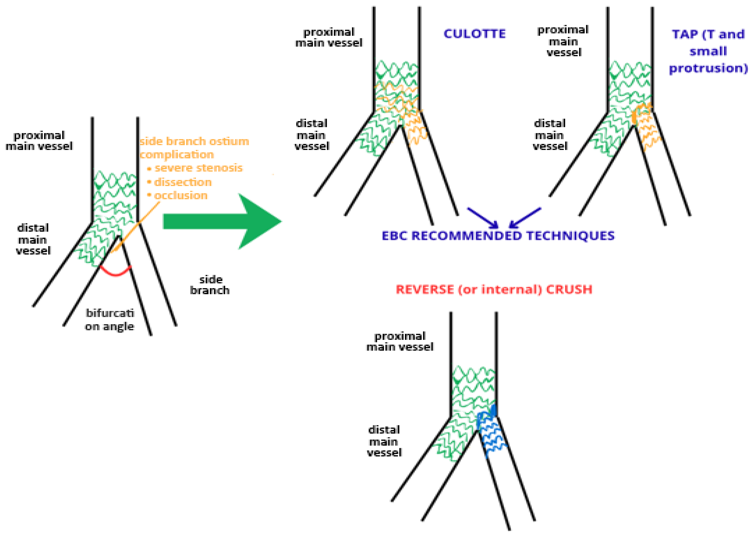 - Re-crossing of the side branch followed by side branch dilatation and final kissing dilatation is necessary.