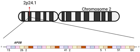 Representation of the APOB gene on chromosome 2 (2p24.1). The upper panel shows the chromosomal localization of the gene. The lower panel illustrates the gene structure, where each colored block represents an exon. Numbers below the exons indicate the number of variants identified within each exon in the present study.