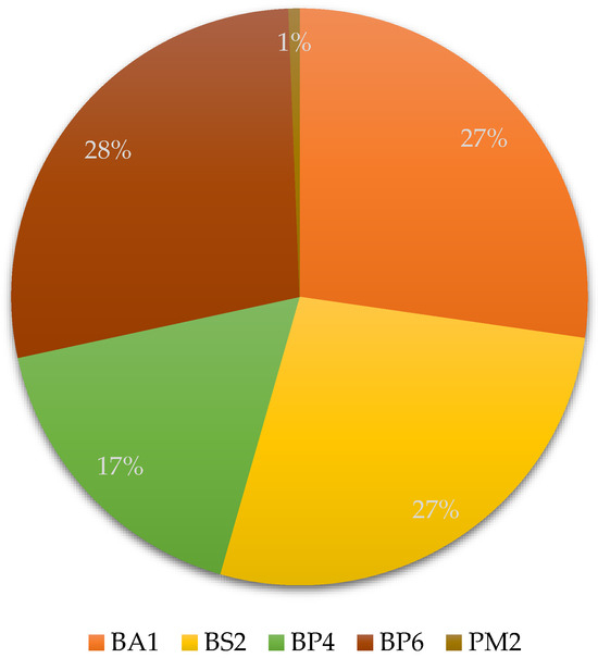 Distribution of APOB variants according to ACMG evidence criteria. The pie chart illustrates the proportion of APOB gene variants identified in the study. Most variants were categorized as benign based on population frequency and computational data: BA1 (benign stand-alone), BS2 (benign strong), BP4 and BP6 (benign supporting). Only a minor fraction of variants exhibited PM2 (pathogenic moderate) evidence, indicating very low population frequency but insufficient data for definitive pathogenic classification.
