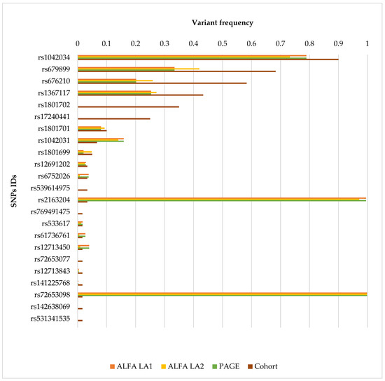 Figure 3 compares the allele frequencies of APOB gene variants identified in our Ecuadorian patient cohort with those reported in ALFA, and PAGE population databases. Furthermore, Supplementary Table S1 summarizes missense variants identified in the cohort, indicating SNP identifiers, HGVS nomenclature, predicted consequences, ACMG classification and criteria, population allele frequencies (ALFA and PAGE), the number of carriers, and the corresponding variant frequencies within the study cohort.