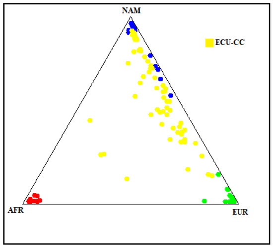 Genetic ancestry composition of the Ecuadorian Mestizo cohort. The plot illustrates the genetic ancestry proportions of the study cohort (yellow dots, labeled ECU-CC) in comparison with reference populations of African (AFR, red), Native American (NAM, blue), and European (EUR, green) origin. Each point represents an individual’s ancestry component estimated from 46 AIMs polymorphisms.