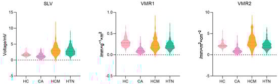 Three voltage indexes among four groups in the violin plot. SLV: Sokolow–Lyon voltage, VMR1: voltage–mass ratio calculated by left ventricular mass index, and VMR2: voltage–mass ratio calculated by cross-sectional area.