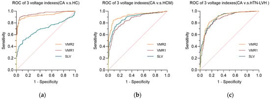 The receiver operating curve (ROC) of three voltage indexes in each comparative groups. (a) AL-CA vs. HC comparative group; (b) AL-CA vs. HCM comparative group; (c) AL-CA vs. HTN-LVH comparative group. SLV: Sokolow–Lyon voltage, VMR1: voltage–mass ratio calculated by left ventricular mass index, and VMR2: voltage–mass ratio calculated by cross-sectional area. The diagonal reference line (dashed) represents the performance of a test with no discriminative ability, serving as a baseline for comparison.