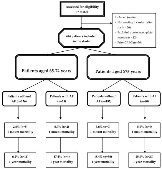 Given these considerations, the present observational study aims to investigate the impact of AF on one-month and one-year all-cause mortality in NSTEMI patients aged ≥65 years. By stratifying the population into 65–74 and ≥75 years subgroups, we aimed to elucidate potential age-dependent differences in the prognostic significance of AF—an issue of growing importance as the population continues to age.
