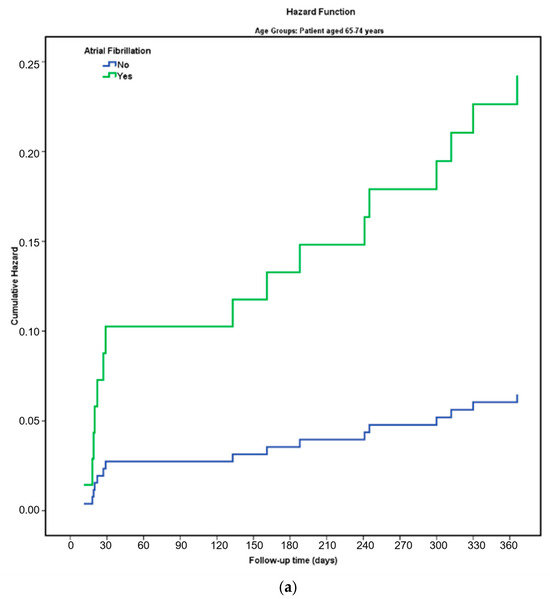 Figure 2 shows the one-year mortality risk curves by age groups. The Kaplan–Meier survival analysis in Figure 2a showed statistically significant differences between the one-year survival curves of groups 65–74 years old with and without AF (Estimation: 348,744, Std. Err: 5.036, X2: 6.910, df:1, Log-Rank p = 0.009). The Kaplan–Meier survival analysis in Figure 2b showed no statistically significant differences between the one-year survival curves of groups with and without AF aged > 74 years (Estimation: 327,756, Std. Err: 5.627, X2: 3.797, df: 1, Log-Rank p = 0.051).