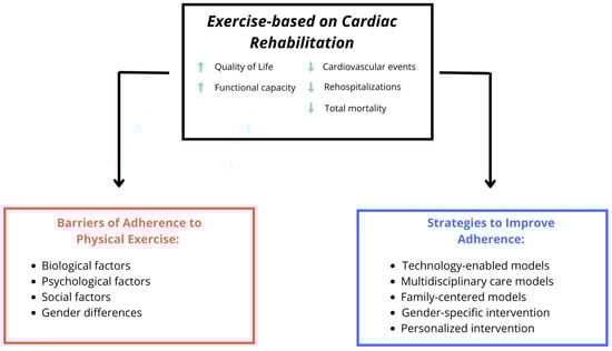 Exercise-based cardiac rehabilitation improves quality of life and prognosis. Adherence is hindered by biological, psychological, social and gender-related barriers, and can be enhanced by technology-enabled, multidisciplinary, family-centered, gender-sensitive and personalized care models.