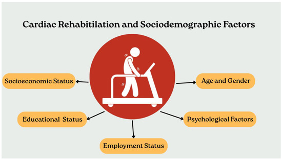 Graphical representation of the main sociodemographic factors that can influence access, adherence, and outcomes of cardiac rehabilitation: socioeconomic status, educational level, employment status, age and gender, and psychological factors.