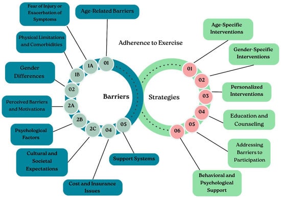 Graphical representation of the main barriers to exercise adherence in cardiac rehabilitation programs and the corresponding strategies to overcome them.