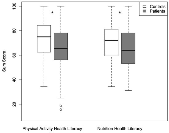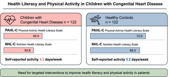 Background: Health literacy can be defined as the ability to access, understand, evaluate, and apply health information in order to make informed health decisions in daily life. Despite its importance, little is known about health literacy in the domains of physical activity and nutrition among children with congenital heart disease. The aim of this study was to examine differences in health literacy related to physical activity and nutrition between children and adolescents with congenital heart disease and a healthy control group (Control). Methods: A total of 244 children and adolescents (age 8–18 years; mean age 13.4 ± 3.1 years, 53.3% girls) were enrolled, comprising 122 patients with congenital heart disease and 122 age- and sex-matched healthy controls. Patients were recruited during routine medical examinations at the German Heart Center, while controls were recruited from Munich schools. The Physical Activity Health Literacy Scale for Children (PAHL-C) and the Nutrition Health Literacy Scale for Children (NHL-C) were used to assess health literacy in the domains of physical activity and nutrition. Scores for both scales were calculated as additive sum scores and converted to a scale from 0 to 100, where higher scores indicate better health literacy. Physical activity levels were measured via self-reported frequency of days per week in which children engaged in at least one hour of physical activity. Results: Children with congenital heart disease showed lower PAHL-C scores (Patients: 65.9 ± 18.0 vs. Control: 72.9 ± 14.9, p = 0.001) and lower NHL-C scores (Patients: 63.6 ± 19.0 vs. Control: 69.3 ± 14.8, p = 0.009) than healthy controls. Boys reported significantly higher self-reported physical activity levels (p = 0.001) and had significantly higher PAHL-C scores than girls (p < 0.001). Patients with congenital heart disease reported significantly less physical activity compared to controls (Patients: 4.2 ± 1.7 days/week vs. Control: 5.2 ± 1.8 days/week, p < 0.001). Conclusions: Children with congenital heart disease demonstrate lower health literacy in the domains of physical activity and nutrition than their healthy counterparts and report being less active. This highlights the need for targeted interventions to address both physical activity and health literacy in children with congenital heart disease. Full article