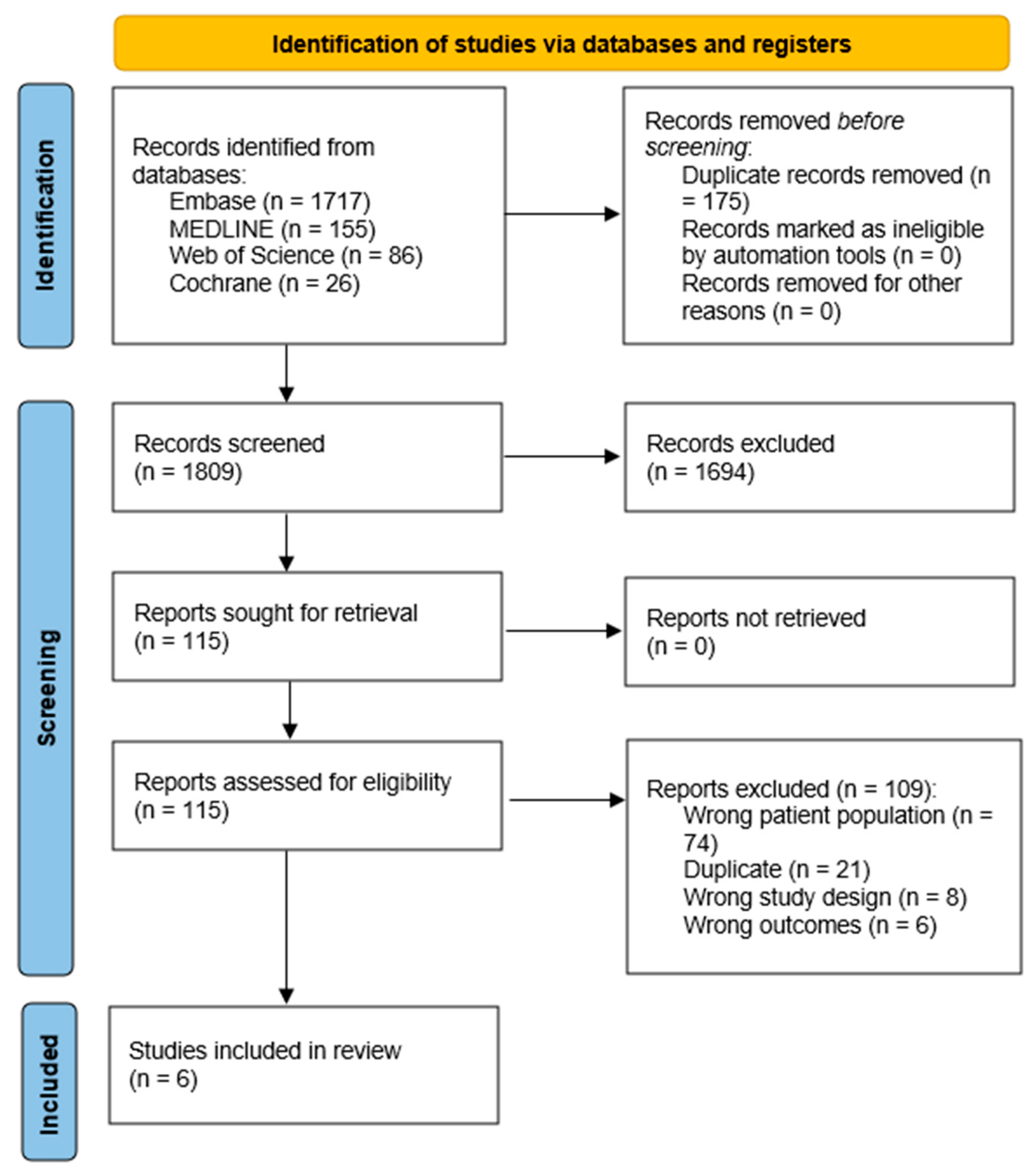 | Embase | 1717 | 1. GLP-1 RAs: (exp glucagon like peptide 1 receptor agonist/OR (“glp-1 receptor agonist” OR “glp-1 agonist” OR “incretin mimetic” OR “incretin-based therap” OR exenatide OR liraglutide OR dulaglutide OR semaglutide OR albiglutide OR lixisenatide OR Byetta OR Bydureon OR Victoza OR Trulicity OR Ozempic OR Wegovy OR Adlyxin OR Tanzeum OR Rybelsus).ti,ab,kw) 2. HFpEF: (exp heart failure, diastolic/OR “heart failure with preserved ejection fraction”.ti,ab,kw OR HFpEF.ti,ab,kw OR “heart failure with normal ejection fraction”.ti,ab,kw OR HFNEF.ti,ab,kw OR “diastolic heart failure”.ti,ab,kw OR “diastolic dysfunction”.ti,ab,kw) 3. Cardiovascular Outcomes: (exp cardiovascular disease/OR “cardiovascular outcome”.ti,ab,kw OR “CV outcome”.ti,ab,kw OR “cardiovascular event”.ti,ab,kw OR “CV event”.ti,ab,kw OR MACE.ti,ab,kw OR “major adverse cardiac event”.ti,ab,kw OR “cardiac mortality”.ti,ab,kw OR “cardiovascular mortality”.ti,ab,kw OR “heart failure hospitalization”.ti,ab,kw OR hospitalization.ti,ab,kw OR “hospital admission”.ti,ab,kw OR “hospital readmission”.ti,ab,kw OR mortality.ti,ab,kw OR death.ti,ab,kw) 4. RCT Filter: (exp randomized controlled trial/OR “randomized controlled trial”.ti,ab,kw OR “randomised controlled trial”.ti,ab,kw OR RCT.ti,ab,kw OR “controlled clinical trial”.ti,ab,kw OR “clinical trial”.ti,ab,kw OR “double-blind”.ti,ab,kw OR “single-blind”.ti,ab,kw OR placebo.ti,ab,kw OR “phase 2”.ti,ab,kw OR “phase II”.ti,ab,kw OR “phase 3”.ti,ab,kw OR “phase III”.ti,ab,kw OR trial.ti,ab,kw) Final Combination: 1 AND 2 AND 3 AND 4 |