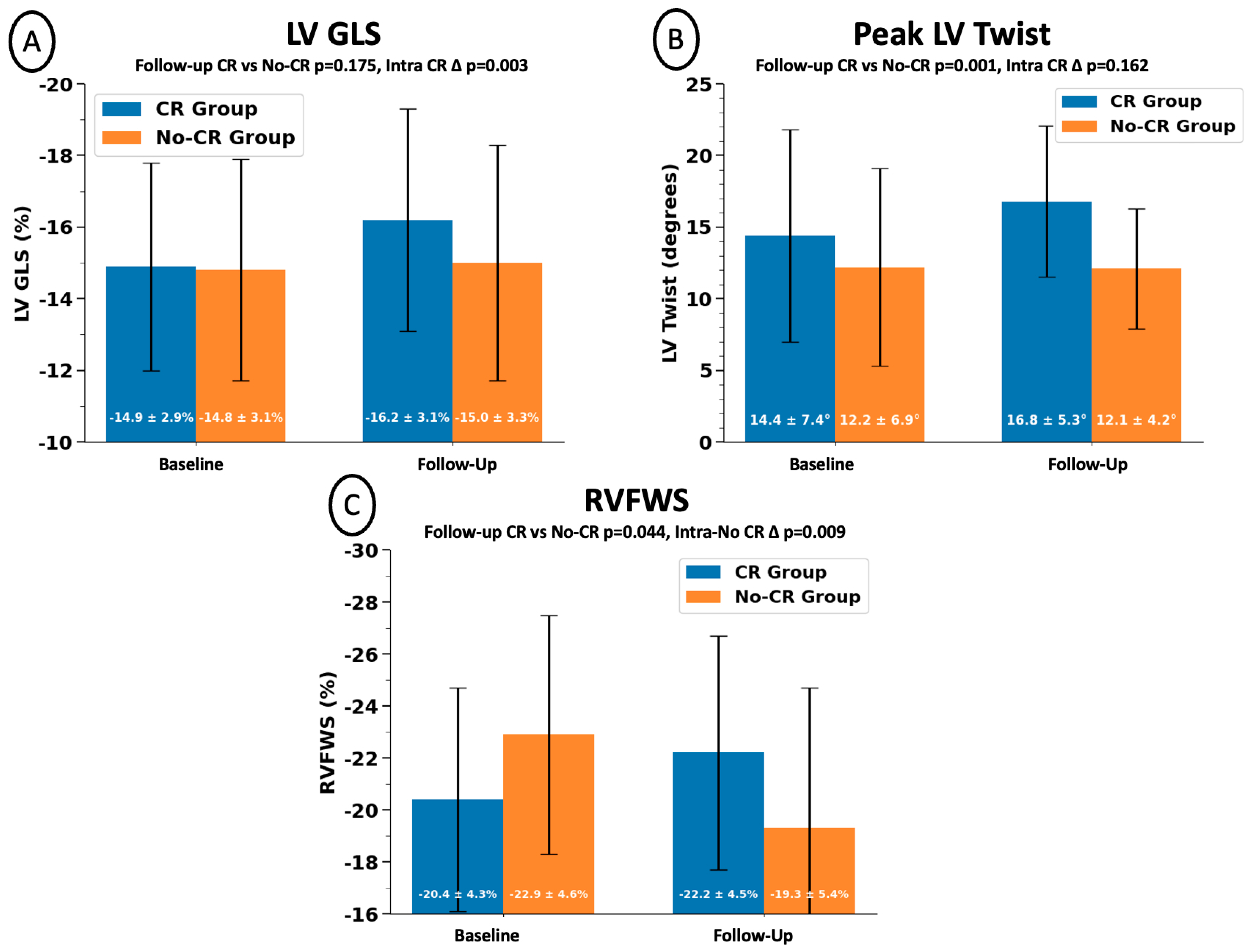 | LV global longitudinal strain (%) | −14.9 ± 2.9 c | −14.8 ± 3.1 | 0.947 | −16.2 ± 3.1 c | −15 ± 3.3 | 0.175 |