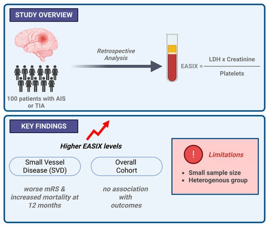 Makris, M.; Ztriva, E.; Gavriilaki, E.; Patriarcheas, V.; Gougoula, V.; Giannakakis, M.; Tselepis, A.; Ntaios, G.; Savopoulos, C.; Kaiafa, G. Prognostic Role of the Endothelial Activation and Stress Index (EASIX) in Functional Outcomes and Mortality After Acute Ischemic Stroke: A Retrospective Pilot Cohort Study. J. Cardiovasc. Dev. Dis. 2026, 13, 66. https://doi.org/10.3390/jcdd13020066