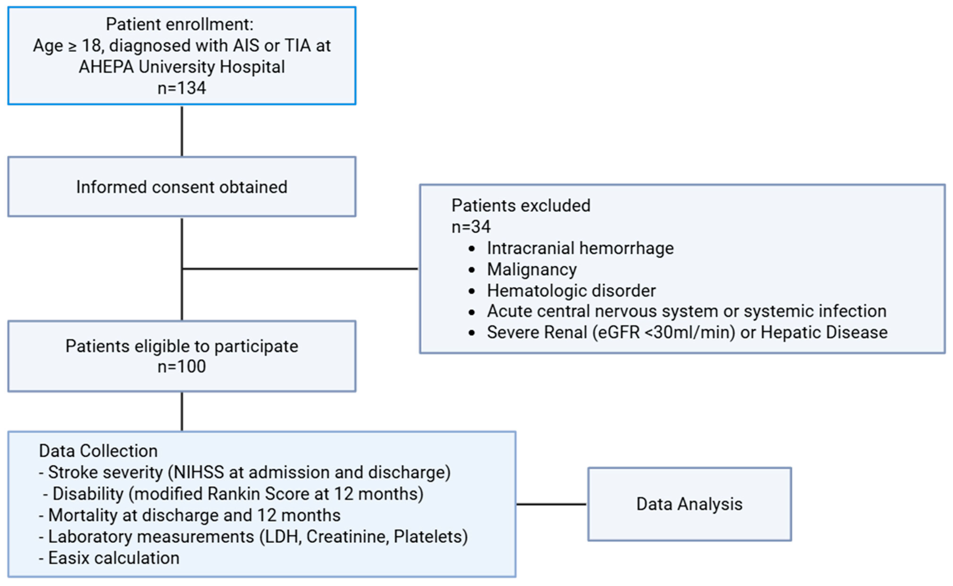 APA StyleMakris, M., Ztriva, E., Gavriilaki, E., Patriarcheas, V., Gougoula, V., Giannakakis, M., Tselepis, A., Ntaios, G., Savopoulos, C., & Kaiafa, G. (2026). Prognostic Role of the Endothelial Activation and Stress Index (EASIX) in Functional Outcomes and Mortality After Acute Ischemic Stroke: A Retrospective Pilot Cohort Study. Journal of Cardiovascular Development and Disease, 13(2), 66. https://doi.org/10.3390/jcdd13020066