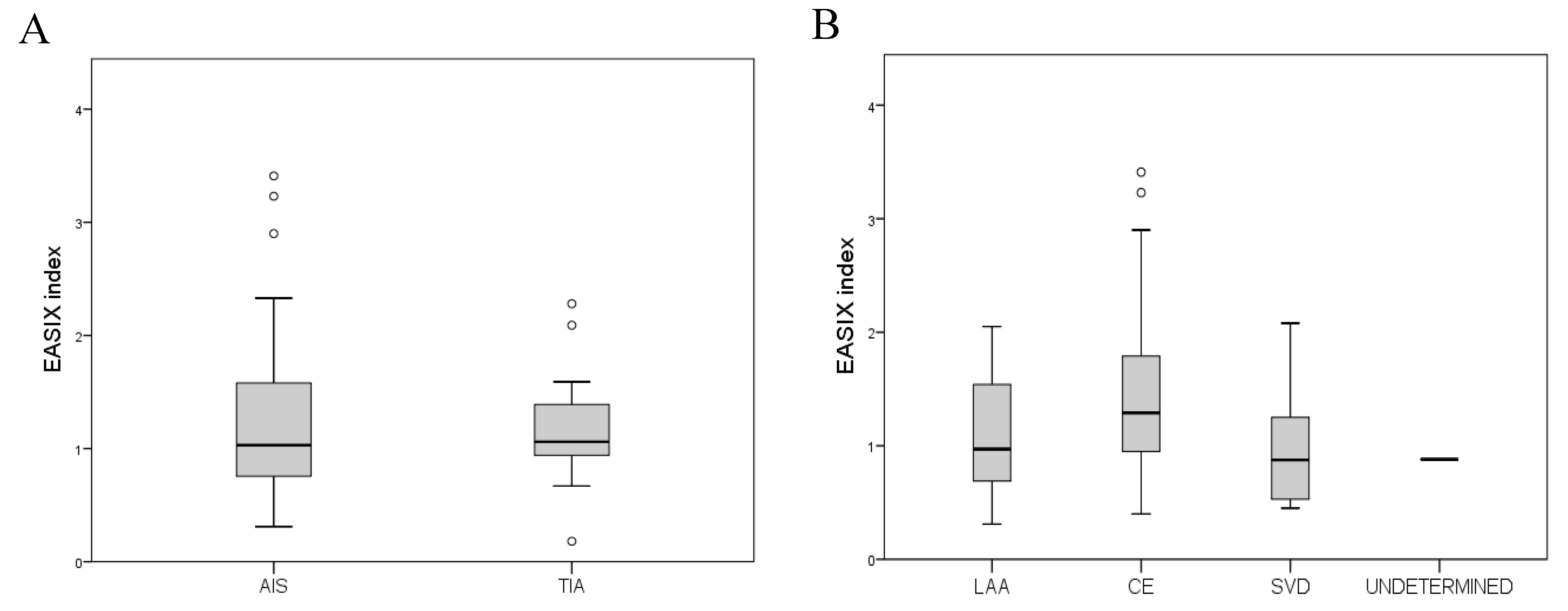 Chicago/Turabian StyleMakris, Michail, Eleftheria Ztriva, Eleni Gavriilaki, Vasileios Patriarcheas, Vasiliki Gougoula, Michail Giannakakis, Alexandros Tselepis, Georgios Ntaios, Christos Savopoulos, and Georgia Kaiafa. 2026. "Prognostic Role of the Endothelial Activation and Stress Index (EASIX) in Functional Outcomes and Mortality After Acute Ischemic Stroke: A Retrospective Pilot Cohort Study" Journal of Cardiovascular Development and Disease 13, no. 2: 66. https://doi.org/10.3390/jcdd13020066