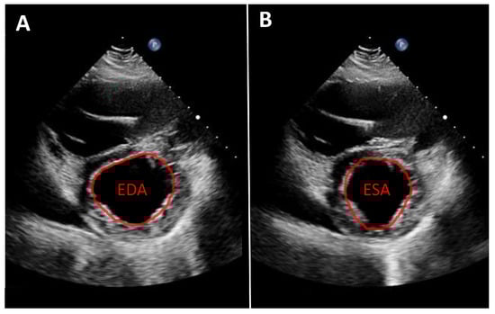 Parasternal short-axis view. Measurement of fractional area change (FAC) in a patient with an LVAD. (A): Planimetry of the end-diastolic area (EDA). (B): Planimetry of the end-systolic area (ESA). Calculation of FAC: FAC = (EDA − ESA)/EDA.