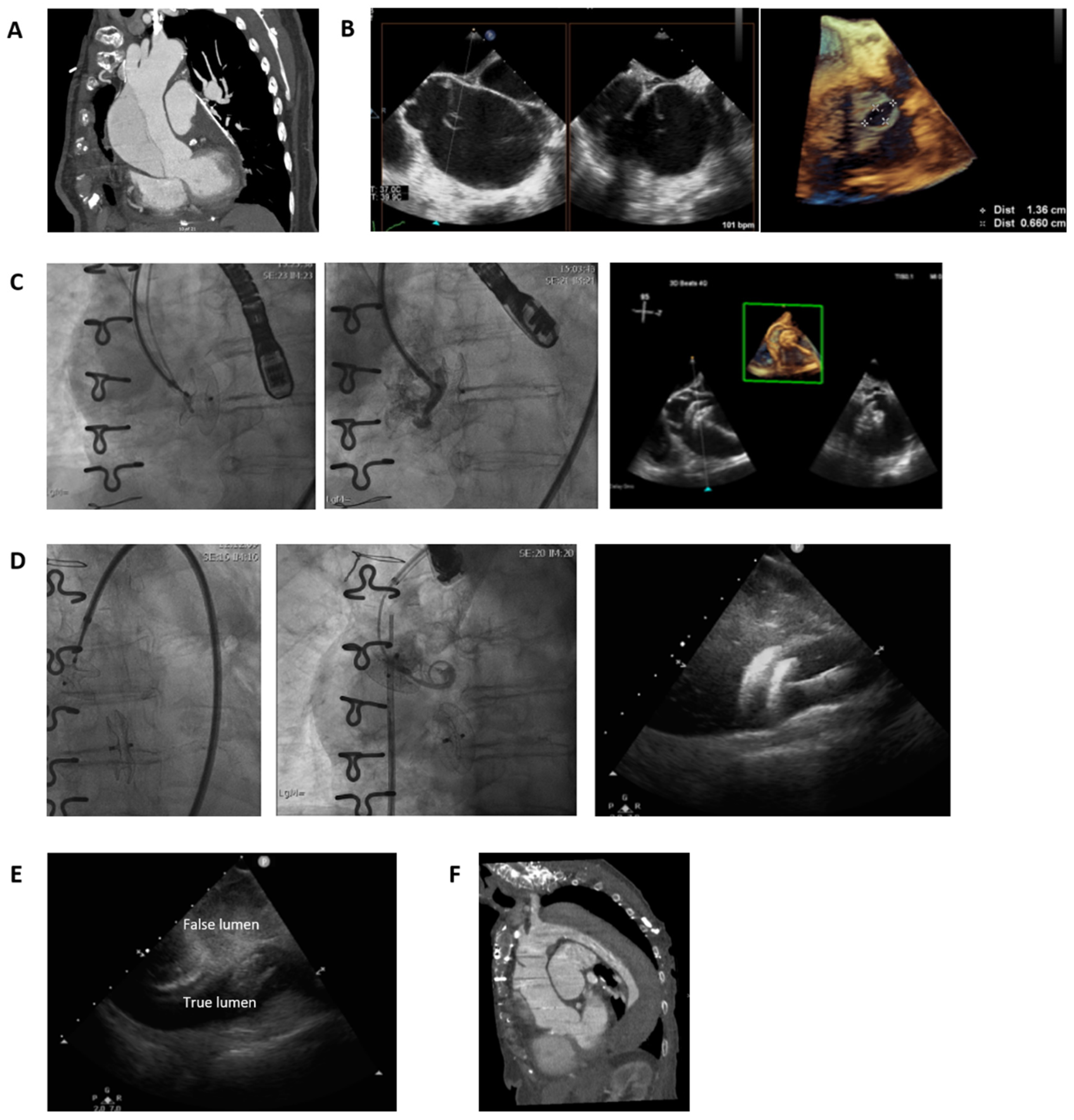- Yuan, X.; Mitsis, A.; Semple Th Castro Verdes, M.; Cambronero-Cortinas, E.; Tang, Y.; Nienaber, C.A. False lumen intervention to promote remodelling and thrombosis-The FLIRT concept in aortic dissection. Catheter. Cardiovasc. Interv. 2018, 92, 732–740. [Google Scholar] [CrossRef] [PubMed]