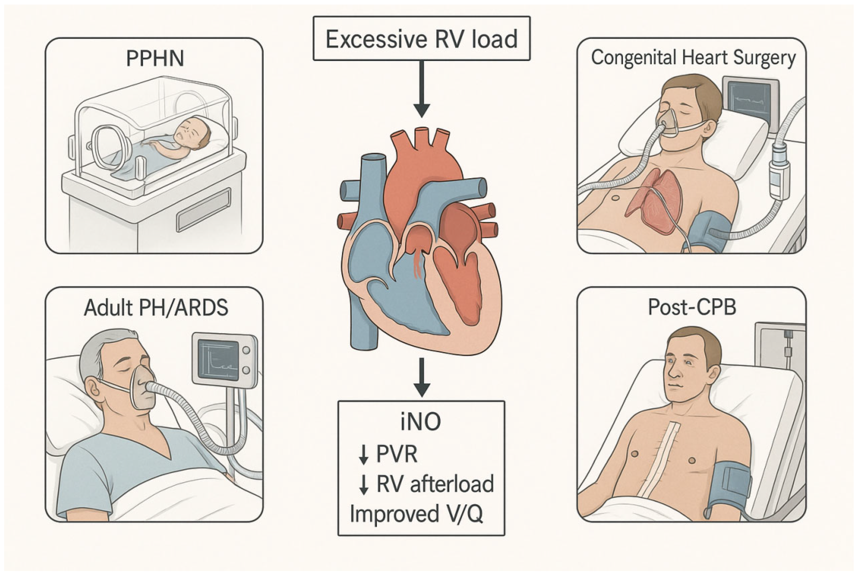 | General principle across scenarios | ↑ PVR → ↑ RV afterload → RV dilatation/dysfunction → ↓ LV filling and output | Systemic hypotension, end-organ hypoperfusion, high mortality | iNO acts as aselective pulmonary vasodilator and RV afterload reducer with minimal systemic hypotension | [4,5,28,40,41] |