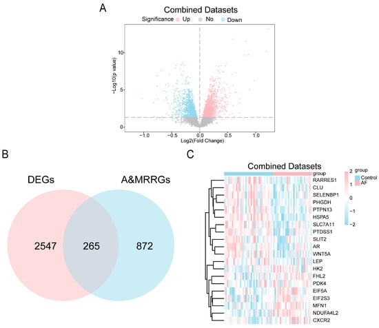 Differential Gene Expression Analysis. (A) Volcano plot of differentially expressed genes between AF and SR groups in the combined GEO datasets. Upregulated genes are shown in pink, down-regulated genes in blue, and non-significantly different genes in gray. The horizontal dotted line indicates the p-value threshold (0.05). (B) Venn diagram of combined datasets of DEGs and A&MRRGs. (C) Heat map of the top 20 A&MRRDEGs in the combined datasets; pink represents high expression and blue represents low expression. Abbreviations: AF, Atrial fibrillation; A&MRRGs, Autophagy- & metabolic reprogramming-related genes; DEGs, Differentially expressed genes.