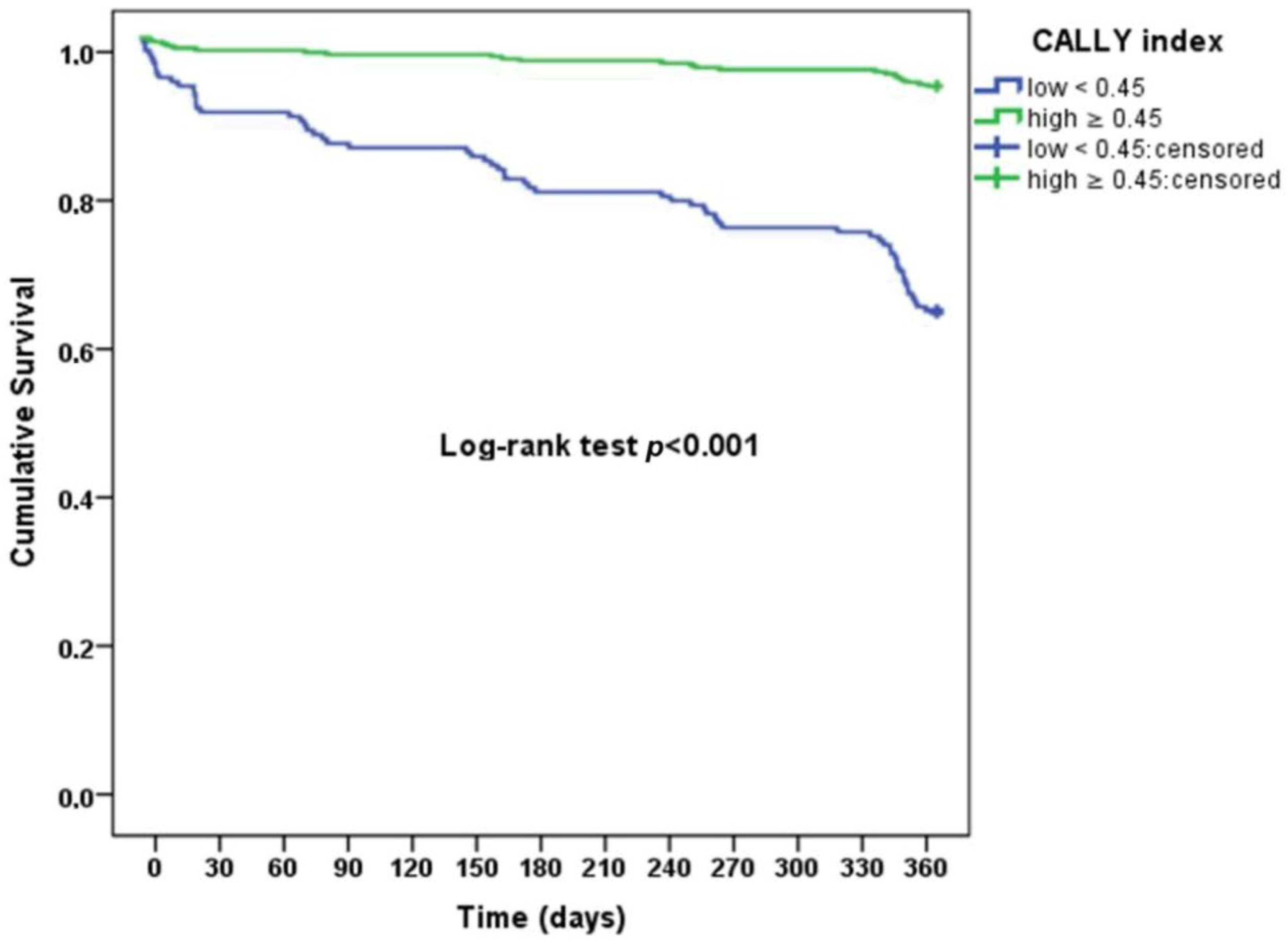 | ** CALLY index < 0.45 | 5.579 (3.146–9.636) | <0.001 | - | - | 3.556 (2.123–5.636) | <0.001 |
