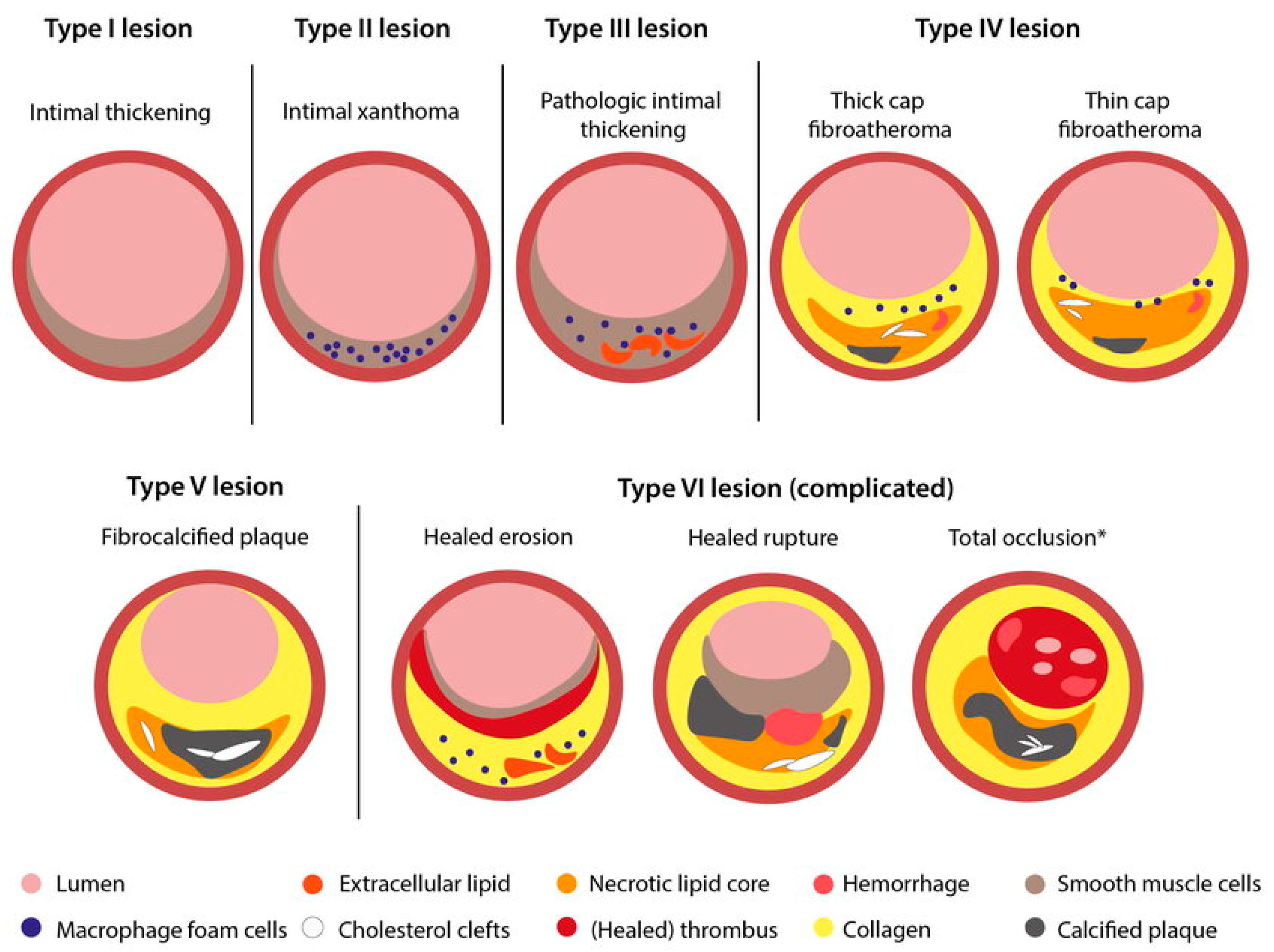 | Early extracellular lipid | Type III (intermediate lesion) | Pathological intimal thickening (PIT) | Pools of extracellular lipid without a necrotic core; SMC-rich intima |