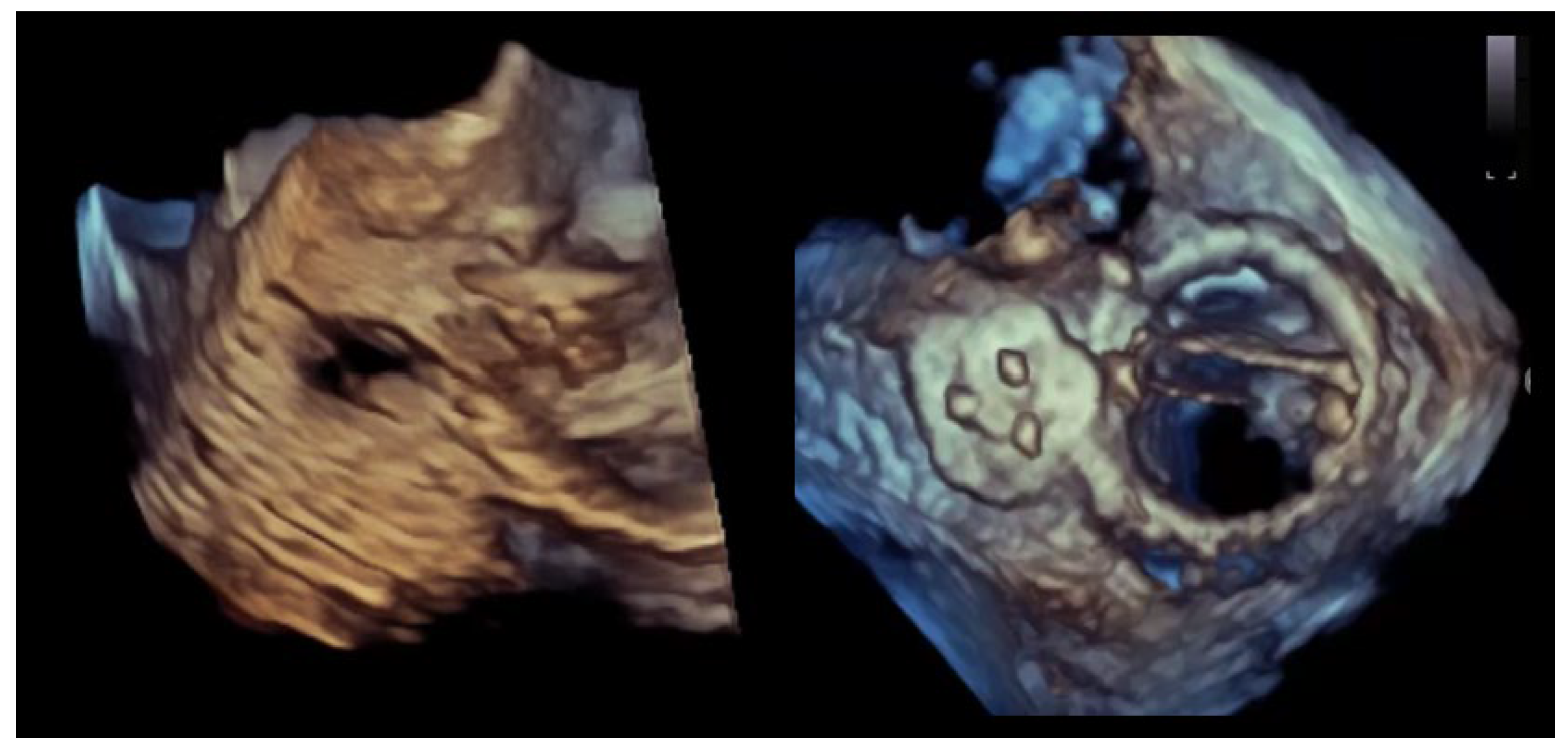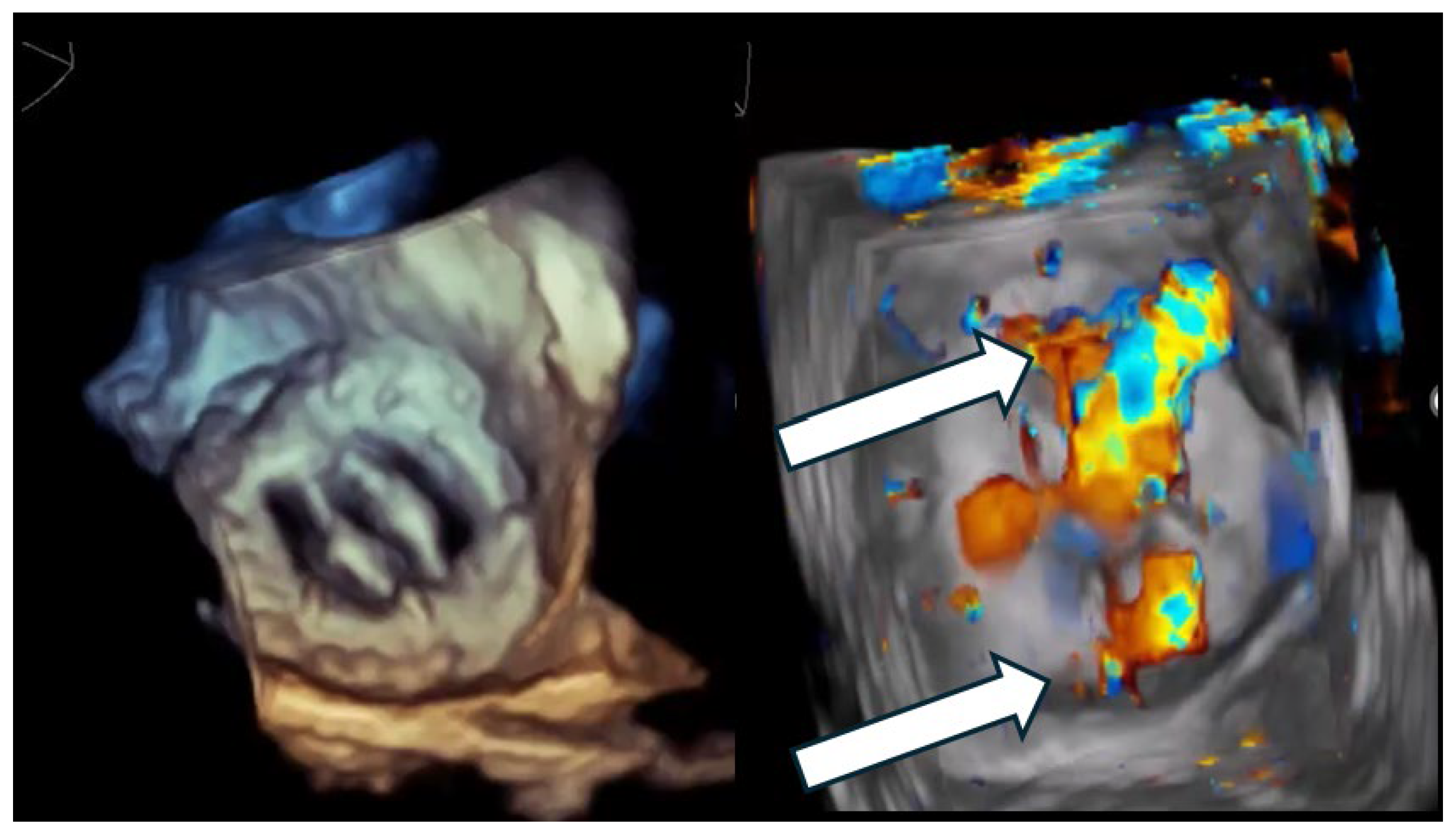- Biner, S.; Kar, S.; Siegel, R.J.; Rafique, A.; Shiota, T. Value of Color Doppler Three-Dimensional Transesophageal Echocardiography in the Percutaneous Closure of Mitral Prosthesis Paravalvular Leak. Am. J. Cardiol. 2010, 105, 984–989. [Google Scholar] [CrossRef] [PubMed]
