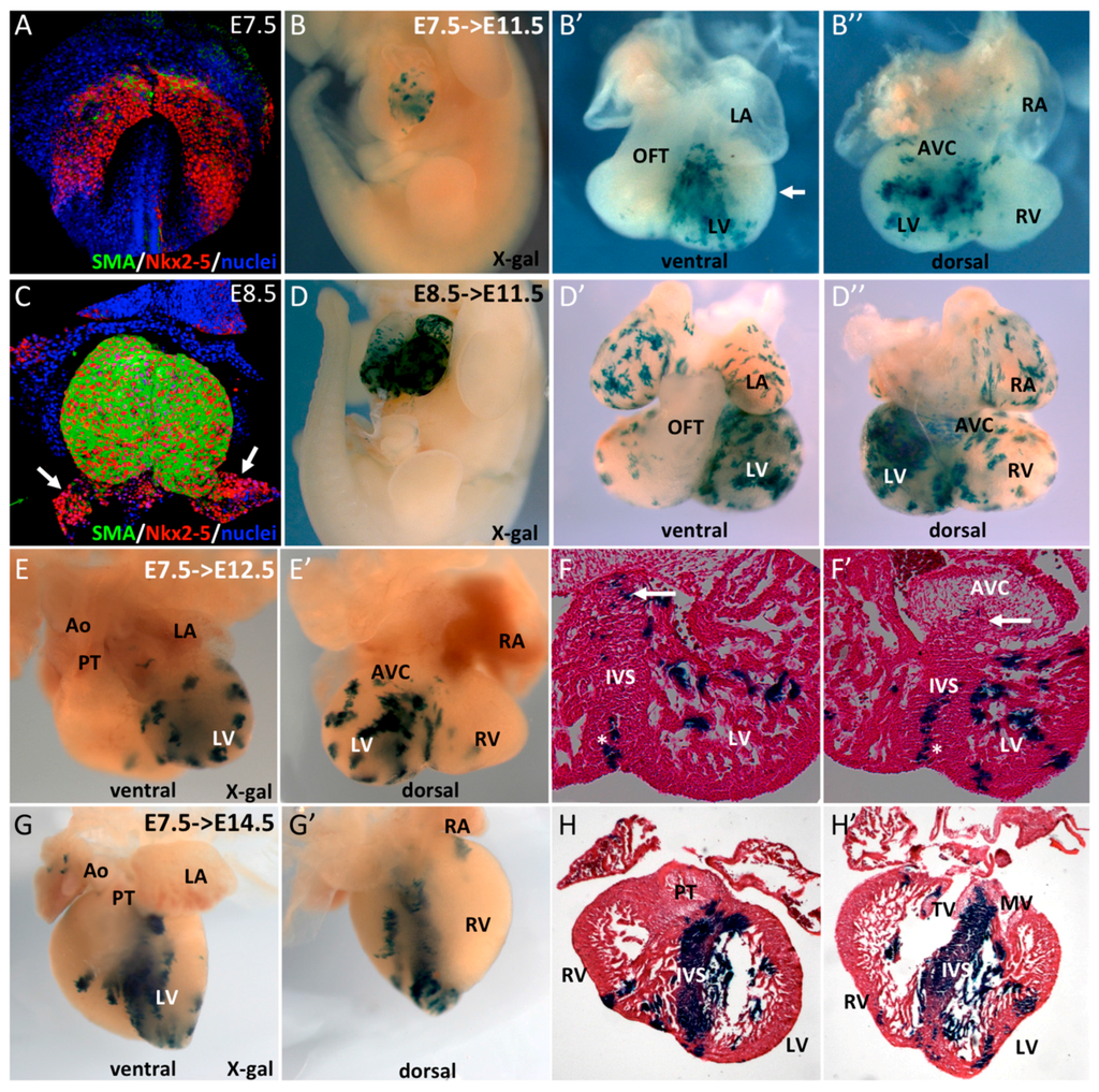 The contribution of early SMA+ cells induced at E7.5 was investigated at later stages of heart development. At E12.5, a comparable staining with that at E11.5 (Figure 1B’,B’’) was observed (Figure 1E,E’). Sections of these hearts show β-gal staining in the interventricular septum (IVS) and both compact and trabecular zones of the LV (Figure 1F,F’). SMA-derived cells are found in the entire IVS, however the upper part of the septum contained fewer and more sparse β-gal+ cells compared to the apical part of the IVS. At later stages, these SMA+ cardiac progenitors contribute predominantly to the formation of the IVS and trabeculae of the LV; only very few β-gal+ cells are observed in the compact myocardium in the apex of the LV (Figure 1G,H). Together, these data show that SMA+ cardiac cells at E7.5 form the primary heart tube and contribute at later stages to the formation of the interventricular septum and left ventricular trabeculae, consistent with FHF contributions to the developing heart.