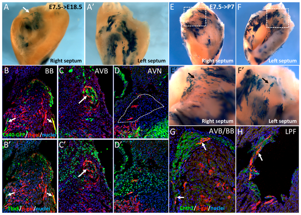 In order to investigate the cell lineage contribution of these SMA+ early cardiac cells to the ventricular conduction system (VCS), R262RLacZ/+::SmaCreER2/+ mice were crossed with Cx40GFP/+ mice expressing GFP specifically in the VCS at fetal and adult stages [19]. Cre activation was performed by tamoxifen injection at E7.5. Hearts recovered at E18.5 or P7 were dissected to isolate the IVS before X-gal staining. At E18.5, β-gal labeling was mainly detected on the left side of the septum (Figure 2A’) and at the crest of the septum in the region of the AVB (arrow in Figure 2A). To further investigate the contribution of these cells to the VCS, we performed immunofluorescence on sections using anti-β-gal and Tbx5 antibodies. Co-expression of Cx40-GFP or Tbx5 with β-gal is observed in both bundle branches (BB) and the AVB (Figure 2B,B’,C,C’). Only very few β-gal+ cells were detected in the AVN (Figure 2D), which is known to derive from the AVC [24]. These results were confirmed in postnatal hearts (P7), by which stage the definitive VCS is established [25]. Extensive labeling was observed on both sides of the IVS (Figure 2E,F) and β-gal+ cells were observed along the crest of the IVS and both sides of the septum (Figure 2E’,F’). This distribution of β-gal+ cells is characteristic of the pattern of the VCS. To confirm that early SMA+ cardiomyocytes contribute to the VCS, immunofluorescence with Contactin-2 and β-gal antibodies was performed and revealed double positive cells in the AVB, BB, and left Purkinje Fibers (Figure 2G,H). These results demonstrate that early SMA+ cardiomyocytes contribute to the formation of the VCS but not to the AVN.