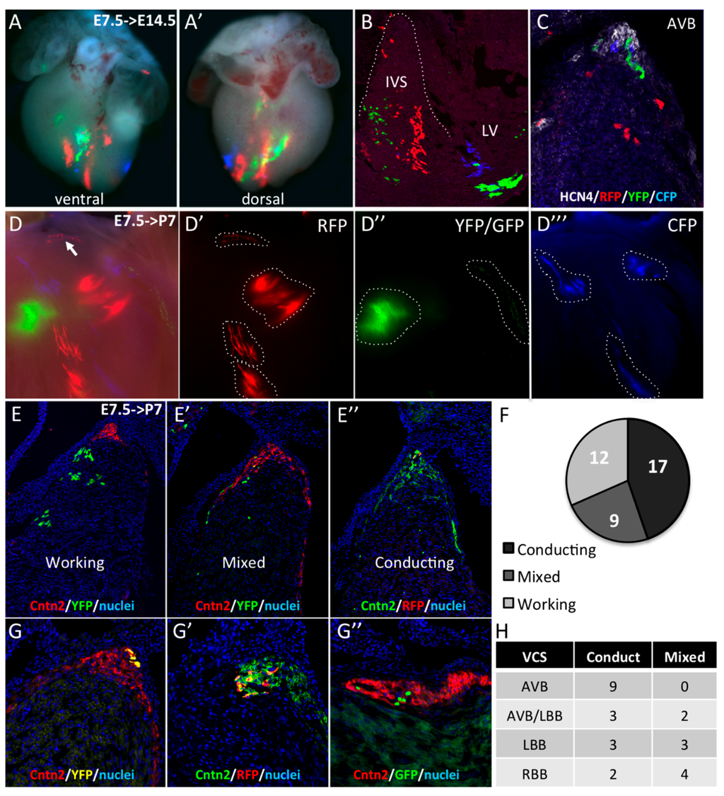 Early segregation of the central ventricular conduction system lineage in SMA+ cardiomyocytes. (A,A’) Whole-mount ventral and dorsal views of an E14.5 SmaCre/+::R26Rconfetti/+ heart with multicolor clusters induced by tamoxifen injection at E7.5. The four fluorescent reporters (GFP, YFP, RFP, and CFP) form independent clusters distributed side by side along the vertical axis in the apical interventricular region. (B) Section of an E14.5 SmaCre/+::R26Rconfetti/+ embryonic heart showing large vertical compact multicolor clones in the apical region of the IVS and scattered labeled cells in the upper part of the septum. (C) Hcn4 immunofluorescence on section of E14.5 SmaCre/+::R26Rconfetti/+ heart showing a heterogeneous contribution of labeled cells to the AVB and BB. (D) Example of clonal labeling in a P7 SmaCre/+::R26Rconfetti/+ heart with a small number of labeled clusters of which one RFP+ cluster is localized at the crest of the septum (arrow). Individual fluorescent reporters are presented in D’ (RFP), D’’ (GFP/YFP) and D’’’ (CFP). (E,G) Cntn2 immunofluorescence on sections from P7 SmaCre/+::R26Rconfetti/+ hearts to classify the nature these clusters. All cells in working clusters are negative for Cntn2 (E), few are positive in mixed clusters (E’) and all are positive for Cntn2 in conducting clusters (E’’). The distribution of these clusters is presented in the graph in the right panel (F). (G,G’,G”) Sections through independent conducting clones of different colors (YFP in G; RFP in G’ or GFP in G’’) showing co-labeling with Cntn2 in the AVB. (H) Table showing the distribution of mixed and conducting clones in different compartments of the central VCS.