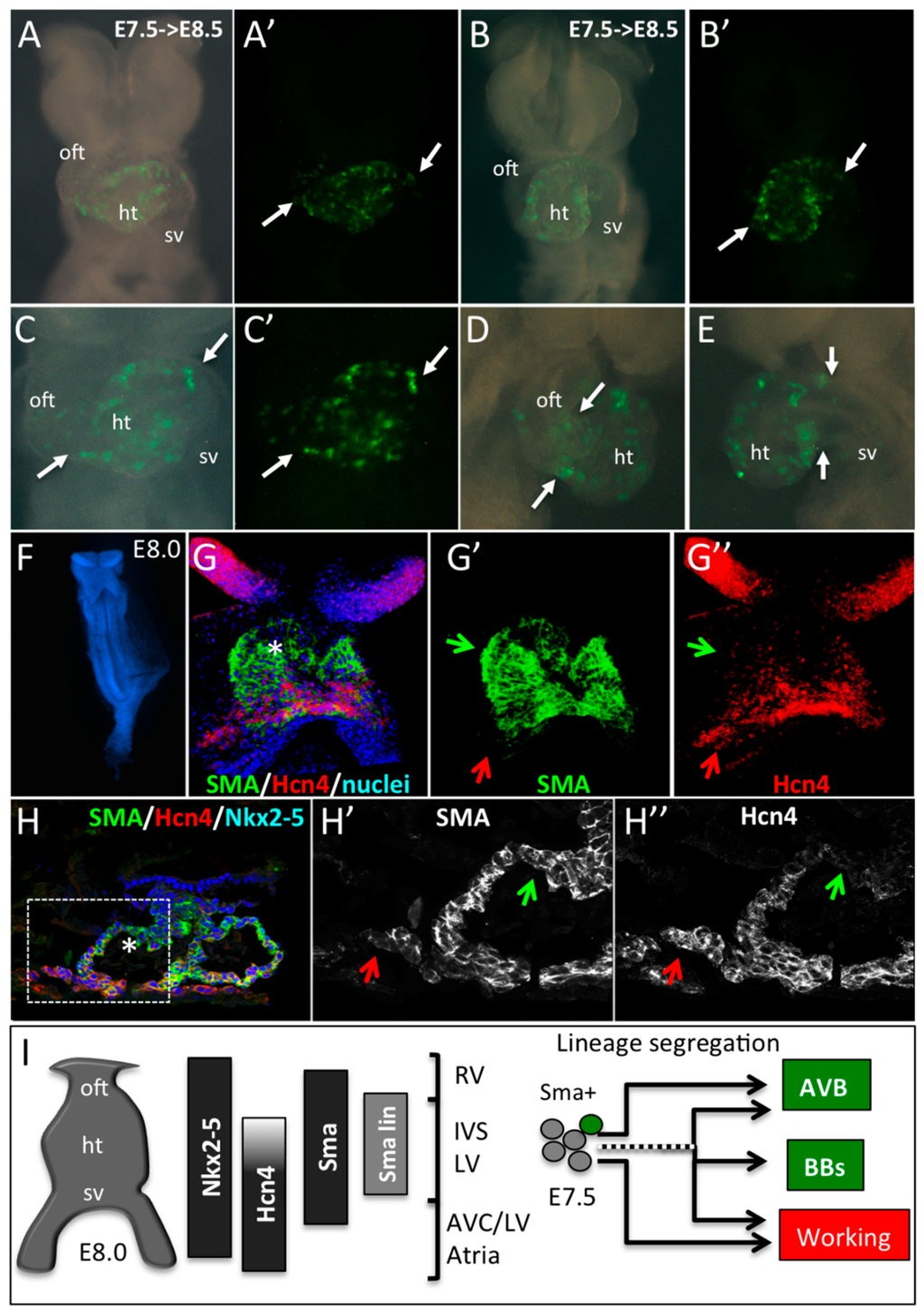 Early SMA+ cardiomyocytes form the primary heart tube. (A–E) Whole-mount bright field or YFP fluorescence (A’–C’) of E8.5 SmaCre/+::R26RYFP/+ embryonic hearts induced by tamoxifen injection at E7.5. Ventral (A–C), right lateral (D) or left lateral (E) views show the presence of YFP+ cells in the heart tube only (ht). Arrows indicate the limit of YFP expression in the heart tube and regions with no labeling such as the outflow tract (oft) and sinus venosus (sv). (F–H) Immunofluorescence on whole-mount (G,G’,G’’) and sections (H,H’,H’’) of E8.0 embryos reveals a co-expression of SMA and Hcn4 in the lower part and a SMA+/Hcn4- expression domain in the upper part of the heart tube (star in G,H). An Hcn4 expression domain is observed at the venous pole (red arrows). Green arrows indicate the presumptive position of the early SMA+ cardiomyocytes in E8.0 heart tube. (I) Schematic representation of the expression domains of Nkx2-5, Hcn4, SMA and E7.5 SMA+ lineage (SMA lin) in the linear heart tube of an E8.0 mouse embryo. The compartments of the heart derived from different subdomains of the early heart tube are shown: RV, Right ventricle; IVS, Interventricular septum; LV, Left ventricle; AVC, Atrioventricular canal, and Atria. Our data suggest that precursors of the central VCS are included in the SMA+/Hcn4- region of the heart tube. While some early SMA+ cardiomycytes have already segregated to the conduction lineage to form the AVB, others, including cells giving rise to the bundle branches (BB), segregate later in embryonic development.