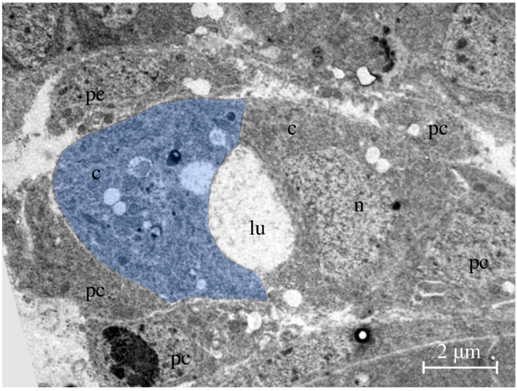 Transmission electron micrograph. The picture shows a cross-section through the heart of a late-stage 16 embryo. Two bean-shaped cardiomyocytes form the heart lumen. One of the two cardiomyocytes is labeled in blue. Abbreviations: c, cardiomyocyte; lu, lumen; n, nucleus; pc, pericardial cell.