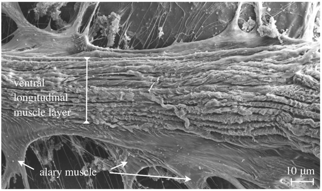 An adult fly was dissected, prepared for Scanning-EM and viewed from the ventral side (inside-out) to demonstrate the layer of ventral longitudinal muscles that run from anterior to posterior underneath the heart tube.