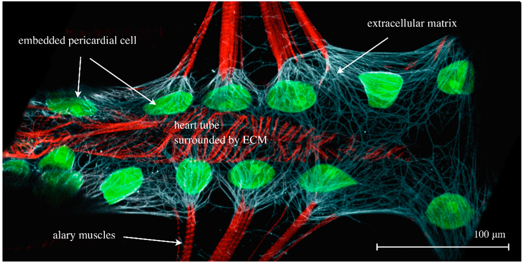Lower hydrostatic pressure systems, on the other hand, such as those found in many mollusks and all arthropods, are commonly associated with open circulatory systems that require less energy to be built and maintained. Drosophila melanogaster displays such an open circulatory system, with a simple tube-like heart that pumps the hemolymph from the posterior body region towards the anterior. The hemolymph represents the interstitial fluid and is often called the insect “blood”, although it lacks the presence of oxygen-transporting blood cells. It directly supplies the organs with nutrients, signal peptides, and all kind of metabolites, hormones and macrophages responsible for wound healing. In addition, the hemolymph contains hemocytes that secrete extracellular matrix (ECM) proteins [3,4] and also contribute to the insect′s immune system. Gas exchange and transport is not the purpose of the heart, since insects harbor a dedicated tubular network, the tracheal system, for this purpose.