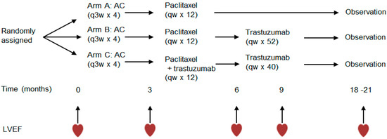 N9831 Clinical Trial: N9831 was a pivotal clinical trial that led to the use of trastuzumab as the standard of care for early HER2+ breast cancer. Patients in the N9831 trial were required to have histologically confirmed adenocarcinoma of the breast with 3+ immunohistochemical staining for HER2 or amplification of the HER2 gene by fluorescence in situ hybridization (≥2.0 ratio) and with either lymph node-positive or high-risk lymph node-negative disease to be eligible for the study. The trial compared adjuvant chemotherapy only (Arm A) vs. adjuvant chemotherapy followed by trastuzumab, either sequentially (Arm B) or concurrently (Arm C), in operable HER2+ breast cancer [8,14]. Patients received serial echocardiograms (ECHO) or multigated acquisition scans (MUGA) for up to 6-years: at baseline, at 3, 6, and 9 months after registration, and after completion of chemotherapy (Figure 1). Long-term cardiac safety analysis was completed in 2016 [15]. The most common cardiac symptom was decline in LVEF by ≥10 points, observed in 26.2% of patients in Arm A (chemotherapy only) and 37.3% of patients who received trastuzumab (Arms B and C). Prevalence of congestive heart failure (CHF) was also significantly higher in patients receiving trastuzumab (3%) compared to those receiving chemotherapy only (0.9%) [15]. The majority of patients who developed CHF received cardiac medications, which included diuretics, beta-blockers, and angiotensin-converting enzyme inhibitors.