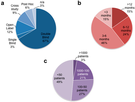 Pie charts for a comprehensive and general overview concerning features of 33 included studies: (a) study type; (b) duration; (c) size.