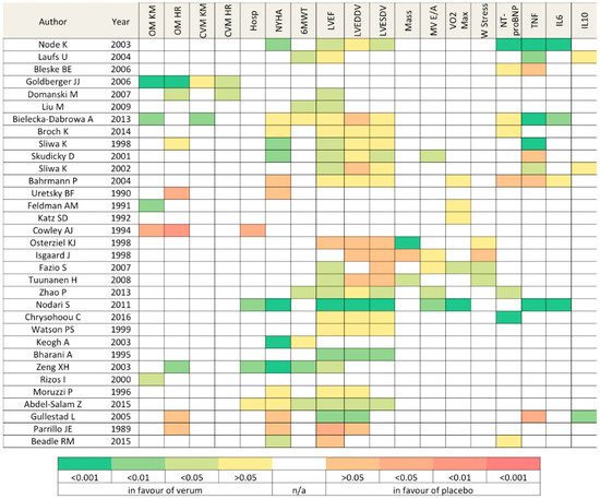 Heatmap reporting statistical significance of molecular results, morphofunctional parameters, and clinical endopoints in 33 clinical studies. Abbreviations—(OM KM) overall mortality Kaplan-Meier, (OM HR) overall mortality Hazard Ratio, (CVM KM) cardiovascular mortality Kaplan-Meier, (CVM HR) cardiovascular mortality Hazard Ratio, (Hosp) hospitalization, (NYHA) NYHA functional class, (6MWT) 6-min walking test, (LVEF) left ventricle ejection fraction, (LVEDDV) left ventricle end-diastolic dimension/volume, (LVESDV) left ventricle end-systolic dimension/volume, (Mass) Cardiac Mass, (MV E/A) Mitral valve E/A ratio, (VO2 Max), maximum oxygen uptake, (W Stress) wall stress.