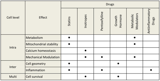 The drug effect on biomarkers revealed a general positive trend of inflammation resolution for several classes (statins, pentoxifylline, PUFAs): TNFα plasma concentration showed up to a threefold decrease with treatment [18]. In contrast, thalidomide increased its concentration. NT-proBNP levels decreased in the aforementioned drug classes too [10,12,16,17,30,32].