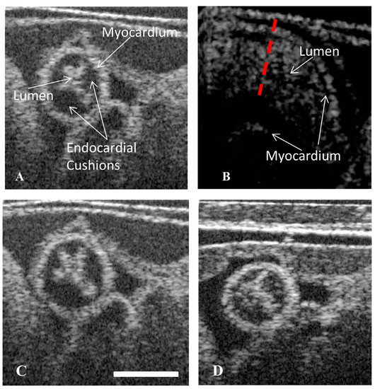 - Rugonyi, S.; Shaut, C.; Liu, A.; Thornburg, K.; Wang, R.K. Changes in Wall Motion and Blood Flow in the Outflow Tract of Chick Embryonic Hearts Observed with Optical Coherence Tomography after Outflow Tract Banding and Vitelline-Vein Ligation. Phys. Med. Biol. 2008, 53, 5077–5091. [Google Scholar] [CrossRef] [PubMed]