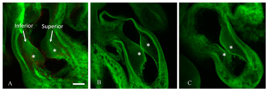 Hyperglycemia induces asymmetric endocardial OFT cushions at Hamburger–Hamilton stage 24 (HH24). Representative confocal images of a slice of the OFT cushions taken in the sagittal plane cushions labeled, and asterisks marking the two endocardial cushions from a representative vehicle control (A), an osmotic control (B), and a d-glucose-treated embryo (C). Scale bar = 100 µm, equivalent across images.