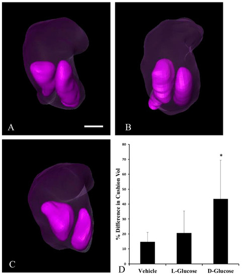 To determine the degree to which cushion asymmetry persisted during development, the differences in cushion volume were quantified in HH24 embryos. By analyzing the cushion volume, the percent difference in the volume of one cushion compared to the other cushion for each embryo was calculated. The analysis of the confocal images (Figure 2) indicated that d-glucose embryos displayed a higher than average percent difference in cushion volume compared to l-glucose and vehicle (data not shown). To confirm this asymmetry in HH24 embryos, micro-CT imaging was used (Figure 3). There were no significant differences between treatments in the surface area and volumes of the atria and ventricle. However, in the OFT, the d-glucose-treated embryos had a significantly lower surface area and volume compared to the vehicle and osmotic control. The volume of each cushion was measured, and the percent difference in OFT cushion size was calculated for every embryo. Similar to the confocal microscope measurements, the d-glucose embryos showed a higher percent difference in cushion size compared to the two control conditions (Figure 3D).