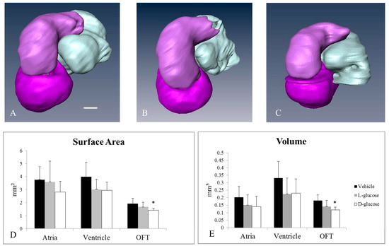 Micro-CT analysis of HH24 hearts reveals differences in endocardial OFT properties in response to hyperglycemia. Representative, reconstructed micro-CT images of the atria (white), ventricle (dark purple), and OFT (light purple) for a vehicle control (A), an osmotic control (B), and a d-glucose-treated embryo (C). The average surface area (D) and volume (E) for the heart sections. Scale bar = 100 µm. * p < 0.05 ANOVA.