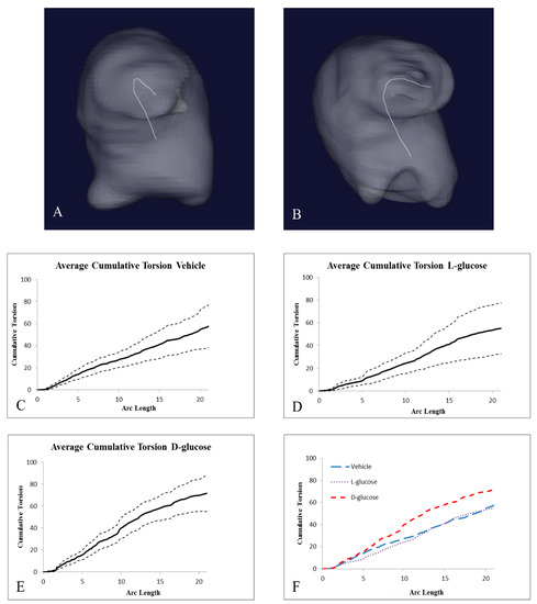 The analysis of micro-CT images indicated the structural differences caused by hyperglycemia (Figure 4). The surface areas and volumes of the atria and ventricles of the d-glucose, l-glucose, and vehicle control embryos were not significantly different among the groups. Yet, both the surface area and volume of the OFT of the d-glucose-treated embryos were significantly smaller compared the l-glucose and vehicle control embryos. Additional analyses of the OFT calculated the torsion for the midline of the OFT using VMTK and MATLAB computations. The average cumulative torsion for each treatment, d-glucose (n = 9), l-glucose (n = 9), and vehicle (n = 12), were plotted against the average arc length (Figure 5). The cumulative torsion for d-glucose-treated embryos was significantly greater than that of either the osmotic control or the vehicle control (Table 2).