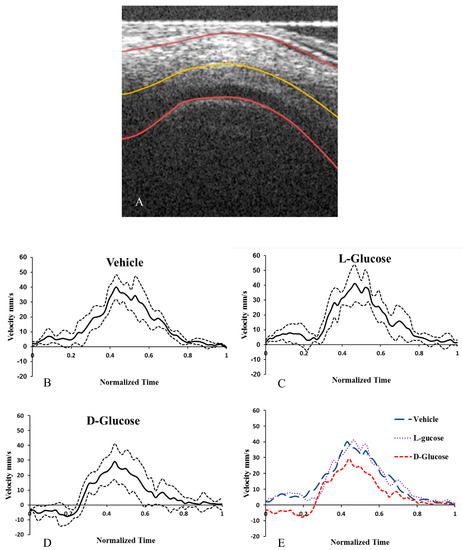 From OCT Doppler data, the average blood flow velocity along the midline of the HH18 OFT was determined for the cardiac cycle. In the d-glucose-injected hyperglycemic embryos, there was backflow at the beginning of the cycle that was not present in the two control conditions (Figure 6). Consequently, in the d-glucose embryos the average velocity and minimum velocity were significantly lower and, importantly, the percent of the cardiac cycle with back flow was significantly higher than the in vehicle and the l-glucose embryos (Table 3).