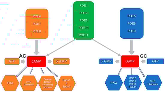 - Juilfs, D.M.; Soderling, S.; Burns, F.; Beavo, J.A. Cyclic GMP as substrate and regulator of cyclic nucleotide phosphodiesterases (PDEs). In Reviews of Physiology, Biochemistry and Pharmacology; Springer: Berlin/Heidelberg, Germany, 1999. [Google Scholar]