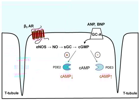 As mentioned above, the hydrolytic activity of PDE2 can be allosterically stimulated by cGMP to limit cAMP levels, referred to as a negative cGMP-to-cAMP crosstalk. In cardiomyocytes, cGMP can be produced by either pGC after ANP, BNP, and CNP stimulation or by the NO-dependent sGC. Sources for NO include both synthesis in other cell types (e.g., by endothelial cells) and inside cardiomyocytes, e.g., by β3-adrenoreceptor (β3-AR) stimulated pathway, which via inhibitory G-proteins leads to NOS activation (Figure 2). PDE2 hydrolyzes cAMP (e.g., produced in response to the β1/2-adrenergic agonists such as noradrenaline), but its stimulation can be in turn limited by its cGMP hydrolyzing activity, which increases in importance when cGMP concentration rises [,]. It has been suggested that PDE2-dependent cAMP hydrolysis might have a more critical effect on cardiomyocyte function, at least under adrenergic overdrive conditions [,,].