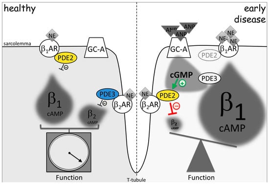Moreover, an elegantly-designed study by Perera et al. [] proved experimentally for the first time that, in early compensated cardiac hypertrophy preceding heart failure, cGMP-sensitive PDE2 and PDE3 were already physically and functionally rearranged between β1- and β2-AR-associated cAMP microdomains despite unchanged whole cell expression levels and activities. More specifically, the switch of PDEs from PDE3 to PDE2 at the β2-AR, accompanied by a reduction of PDE2 at the β1-AR, led to a turnaround of cAMP cross-talk in a way that, in this pathological setting, the ANP/cGMP signaling pathway by this mechanism could enhance β-AR-mediated cardiac contractility inducing positive inotropic and chronotropic effects following β-AR stimulation (Figure 3). The provided evidence shed light on the poorly understood early microdomain remodeling mechanisms. It has been suggested that, in this way, the heart can compensate for the increased contractility demand under pressure overload []. However, our knowledge about microdomain-related contractility mechanisms in early disease is still in its infancy and has to be improved.