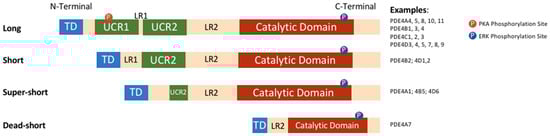 PDEs are a large super-family of enzymes, which are the products of 11 different gene families, grouped according to their structure, function, and affinity for cAMP and cGMP. Structurally, all PDEs have conserved carboxy-terminal catalytic cores while their amino-terminal regions differ among families, subfamilies, and specific isoforms. The N-terminal regions have a number of functional roles. These include the targeting to specific subcellular locations and to signalosomes, and the modulation of responses to signals from regulatory molecules or post-translational modifications [,]. cAMP-specific PDE4s make up the largest family with over 20 isoforms encoded by four genes (A, B, C, and D). Each isoform has a unique N-terminal region, made up of an N-terminal targeting domain (TD). Additionally, the N-terminal region contains upstream conserved regions 1 and 2 (UCR1 and UCR2), which are linked to each other and to the catalytic domain by linker region 1 and 2 (LR1 and LR2) respectively []. Based on the presence and size of UCR1 and UCR2, PDE4 isoforms can be categorised into long, short, super-short, and dead-short isoforms (Figure 1); long isoforms have both UCR1 and 2, short isoforms have only UCR2, super-short have a truncated UCR2, and dead-short isoforms lack both UCR domains and have a truncated catalytic domain [].