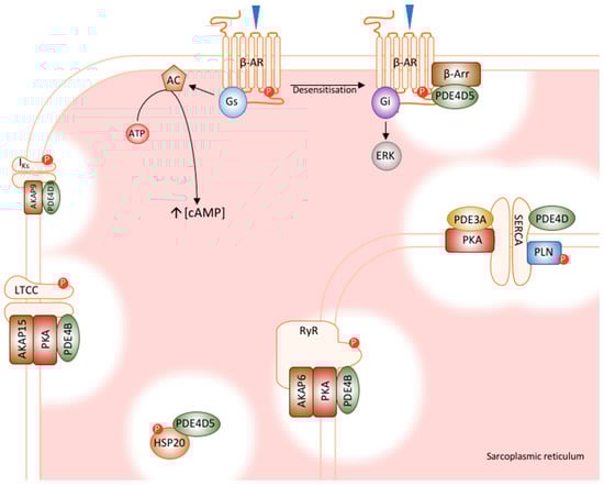 The small, highly diffusible molecule, cAMP can be produced by both membrane-bound adenylyl cyclase (mAC) and soluble adenylyl cyclase (sAC) in response to various stimuli, such as the activation of various Gs-coupled receptors, which activates mAC []. Its properties suggest that it would quickly diffuse throughout the cell, simultaneously activating all effector proteins almost instantly. In striking contrast, it was shown by Larry Brunton and colleagues in the early 1980s that cAMP can cause multiple discrete receptor specific responses in the same cells [,]. To explain this phenomenon, it was quickly postulated, and eventually proven, that compartmentalisation of cAMP signalling underpins receptor specific responses by restricting the number and identity of PKA substrates that get phosphorylated in response to each specific receptor ligation [,]. Such fine control of one ubiquitous second messenger that acts to activate only discrete pools of PKA is made possible by the subcellular localisation of proteins that degrade cAMP. This function is attributed to a super-family of enzymes called phosphodiesterases (PDEs). PDEs are the only known route to the hydrolysis of cAMP and this function empowers these enzymes to act as “sinks”, reducing cAMP concentration in localised areas preventing the inappropriate phosphorylation of PKA substrates under basal conditions. Following receptor activation, however, this situation can be altered to allow cAMP concentrations to exceed the activation threshold of PKA enzymes tethered to discretely positioned “signalosomes”. This situation occurs only when the cAMP concentration in the vicinity of the relevant “signalosomes” is high enough to swamp the PDE component, promoting downstream physiological effects []. The integration of PDE4 isoforms into specific “signalosomes” within the heart and the function of these protein complexes will be the subject of this review.