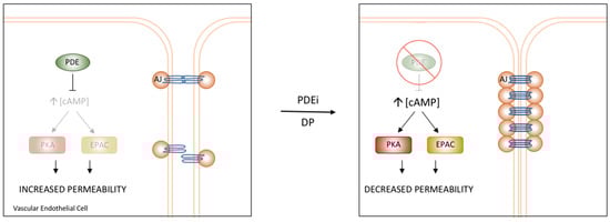 PDE regulation of Vascular Endothelial Permeability. PDE4D has been shown to regulate the permeability of the vascular endothelium through interactions with components of AJs. Treatment with PDE inhibitors or a specific disruptor of the PDE4D/EPAC1 interaction results in increased cAMP and stabilization of AJs, ultimately causing reduced permeability and increased barrier function [].