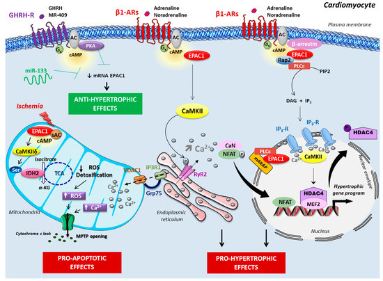 Epac signalosome in cardiac hypertrophy and ischemia. Under adrenergic stimulation, the Epac1–β-arrestin complex is recruited at the β1-AR, and activates a pro-hypertrophic signaling pathway. Epac1 is also scaffolded at the nuclear envelope with phospholipase C (PLC)ε and muscle-specific A-kinase anchoring proteins (mAKAP) to regulate the hypertrophic gene program. In the nuclear/perinuclear region, PLCε increases nuclear Ca2+ content via the activation of the perinuclear IP3 receptor (IP3-R). Epac1 hypertrophic signaling also involves CaMKII-dependent phosphorylation of RyR2, leading to Ca2+ leak from the sarcoplasmic reticulum and subsequent calcineurin (CaN) activation. The anti-hypertrophic action of the growth hormone-releasing hormone (GHRH) or its agonistic analog, MR-409, involves the protein kinase A (PKA)-dependent inhibition of Epac1 expression. MicroRNA-133 (miR-133) is cardioprotective, and targets several components of β1-AR signaling. In the context of cardiac ischemia, mitochondrial Epac1 (MitEpac1) is activated by cAMP produced by the soluble adenylyl cyclase (sAC), and increases Ca2+ overload and ROS accumulation to promote mitochondrial permeability transition pore (MPTP) opening and cardiomyocyte apoptosis. α-KG,α-ketoglutarate; β1-AR, β1-adrenergic receptor; AC, transmembrane adenylyl cyclase; CaMKIIδ, Ca2+/calmodulin-dependent protein kinase II δ-isoform; cAMP, cyclic adenosine monophosphate; DAG, diacylglycerol; GHRH-R, GHRH receptor; GRP75, chaperone glucose-regulated protein 75; HDAC4, histone deacetylase 4; IDH2, isocitrate dehydrogenase 2; IP3, inositol-1,4,5-trisphosphate; IP3R1, IP3 receptor 1; IP3R1, inositol-1,4,5-triphosphate receptor 1; MEF2, myocyte enhancer factor-2; NFAT, nuclear factor of activated T-cells; PIP2, phosphatidylinositol 4,5-biphosphate; ROS, reactive oxygen species; Ser, serine; TCA, tricarboxylic acid cycle; VDAC1, voltage-dependent anion channel 1.