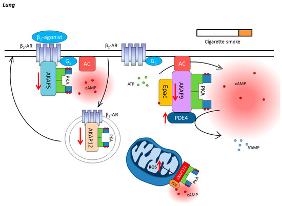 As one of the most vital pharmaceutical targets in COPD, β2-AR directly interacts with AKAP5 and AKAP12, which modulate either the downstream extracellular signal-regulated protein kinase (ERK)1/2 activation or receptor resensitization [81,94,95,96]. Therefore, it is believed that AKAP5 and AKAP12 play a pivotal role in modulating the effect of β2-agonists on COPD pathological development. Poppinga et al. showed that less AKAP5 and AKAP12 proteins could be detected in CS-exposed ASM cells, which was also confirmed using lung tissues from COPD patients [97]. Moreover, st-Ht31, which disrupts global AKAP–PKA interactions (see Figure 3), increased the IL-8 secretion induced by CS exposure in human ASM cells, and reduced the suppression of β2-agonist fenoterol through disturbed ERK signaling [97]. On the contrary, AKAP5 and AKAP12 expression were not significantly changed by CS in human bronchial epithelial cells [98], indicating a different regulatory pathway involved other AKAP members in epithelial cells (Figure 3). Indeed, it has been demonstrated that AKAP9, which binds and regulates ACs [99,100], was able to maintain epithelial barrier function [99] (Figure 3). In addition, as a major site for energy generation and reactive oxygen species (ROS) production, mitochondria cAMP compartments was regulated by a set of mitochondrial AKAPs. In particular, AKAP121, tethering PKA to the outer wall of mitochondria, play a pivotal role in mitochondrial function maintenance and keeping the tolerance to oxidative stress in vascular smooth muscle cells [101], indicating a potential protective effect on CS-induced ROS production for future studies (Figure 3).